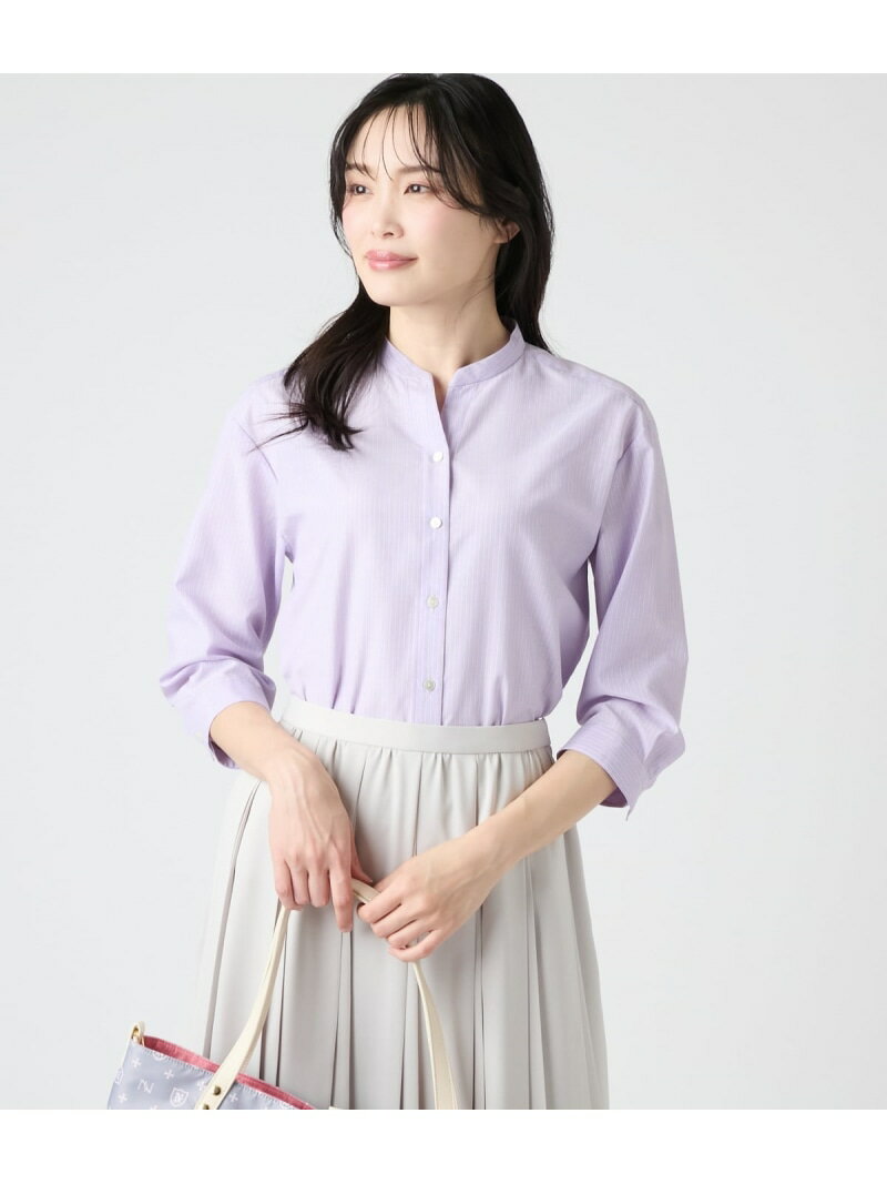 【L】リネンブレンドストライプ 7分袖スタンドカラーシャツストライプ柄が爽やかな、7分袖のスタンドカラーシャツ。