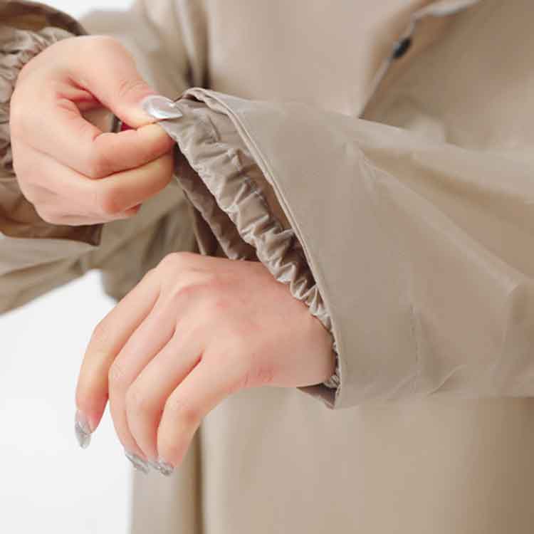 膝下までカバーするロング丈、体がしっかり覆われ、レインブーツを履けば足元まで濡れない、全身を雨から守ることができます。