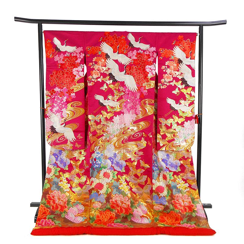 サイズ(cm) 打掛 紋付 〜165 〜185 素材 打掛:正絹仕様 紋付、袴:正絹 長襦袢:合成繊維 肌着、足袋:綿 色 赤 柄 花柄、鶴 紋 丸に違い鷹の羽 セット内容