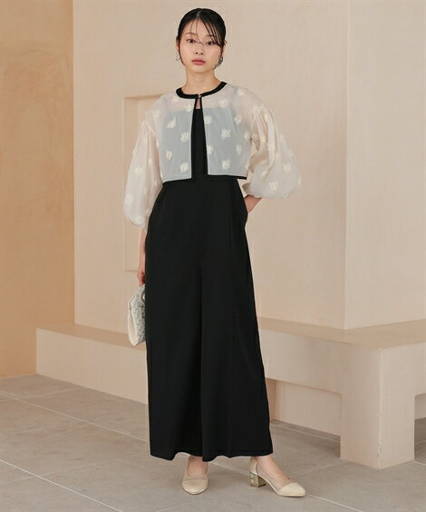 【着痩せポイント】 ・ショート丈ボレロがウエスト位置を高く見せ脚長効果に ・ふんわりスリーブが二の腕をさりげなくカバー ・オールインワンは縦ラインが強調され、すっきり美シルエット ・上下がつながったデザインで腰回りも自然にカバー