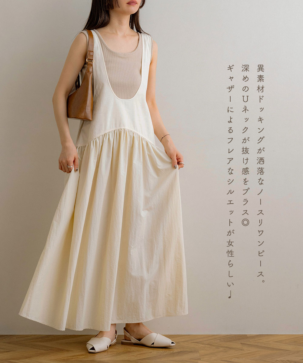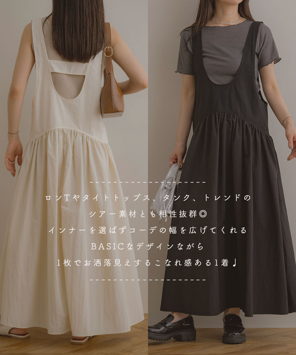 コーディネートに使用したアイテム 検索ワード:ドッキング ジャンスカ ジャンパースカート レディース ワンピース レイヤード キャミワンピ アイボリー ブラック 白 黒 大人 ママ シンプル 2025 2025ss 春夏 レディースファッション ゆったり ママコーデ ニュアンスカラー スタイルアップ 着痩せ オールインワン ワンピース noahl ノアル