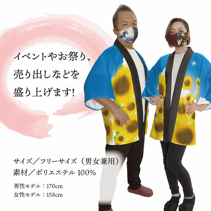 ●名入れ 襟に文字を入れることができます! ●イベントに最適です! ●シワになりにくい光沢感のある平織、なめらかな手触りです! ●外国人に大変人気です!お土産・プレゼントに最適です! 商品仕様 サイズ フリーサイズ:身長の目安155〜175cm、身幅60cm、着丈80cm、袖丈30cm、袖幅30cm、襟幅6cm 素材 ポリエステル 100% 生産地 群馬県桐生市 詳細