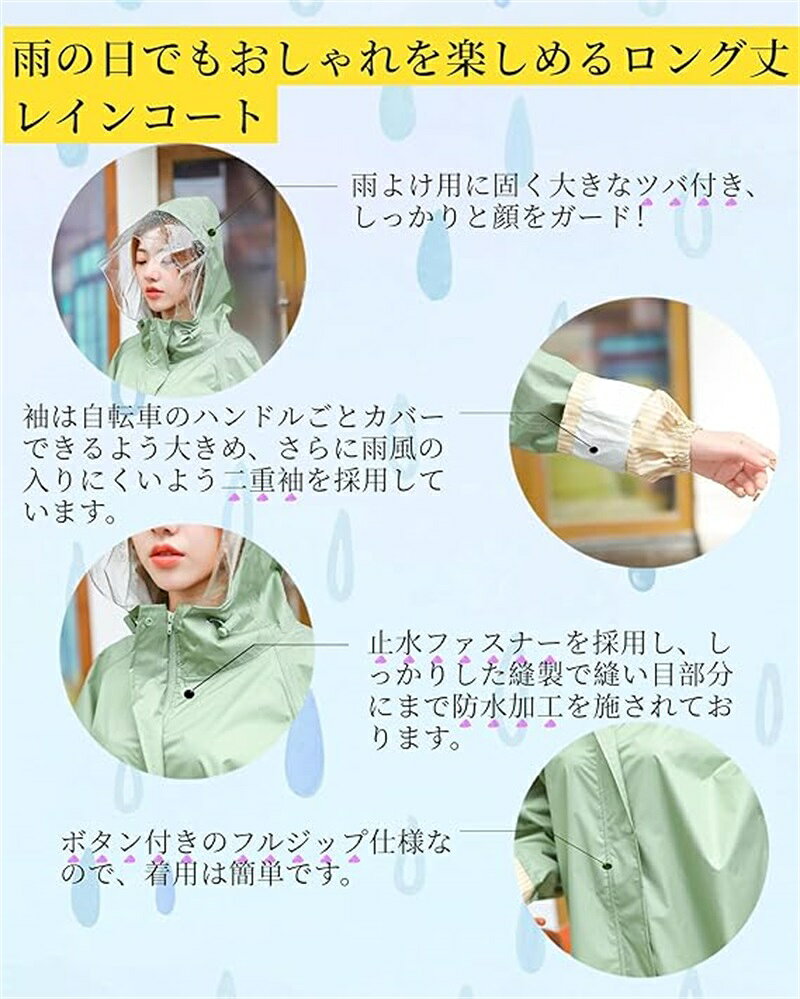 お気に入りの服を濡らしたくない日や、自転車で通勤、通学、保育園、犬の散歩、キャンプなどのアウトドア活動に行くときに便利です。