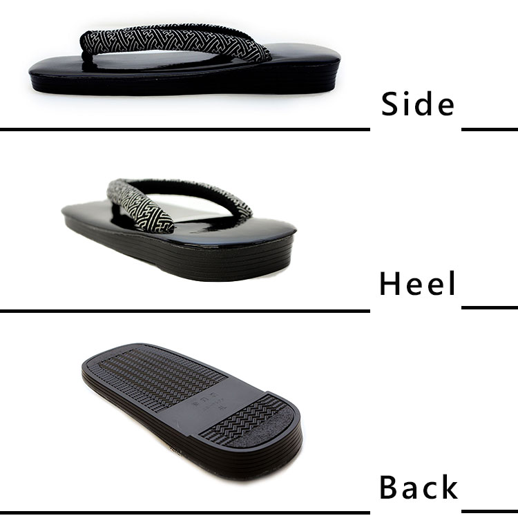 シックな黒台は光沢感のがあり高級感を演出してくれます、鼻緒の紗綾柄は定番柄としても人気が高いです。