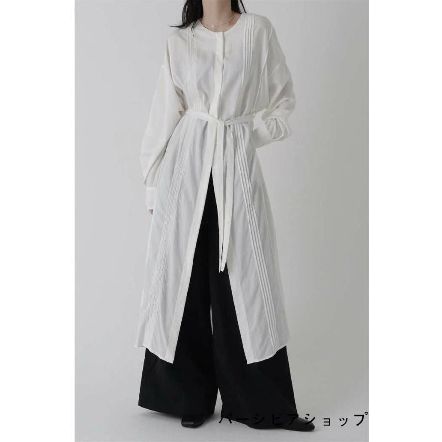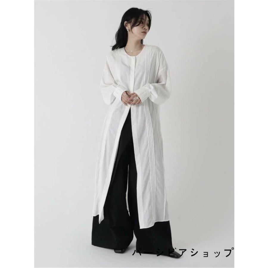 シャツワンピース 長袖 春 秋 ノーカラー ロング丈 大きいサイズ 白 ホワイト ロング丈シャツ ワンピース プリーツ ワンピース 羽織り レディース 夏 秋 春 ゆっ