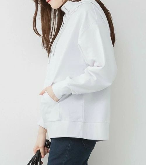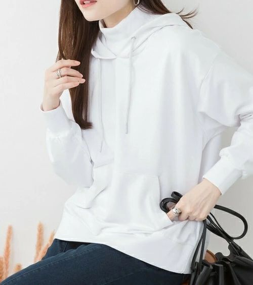 ラフに可愛いハイネックリブ裏毛パーカー 後ろ姿をセンスよく見せるこだわりの立体感のあるフードで ゆるっとラフに着こなせる1着に仕上げました。