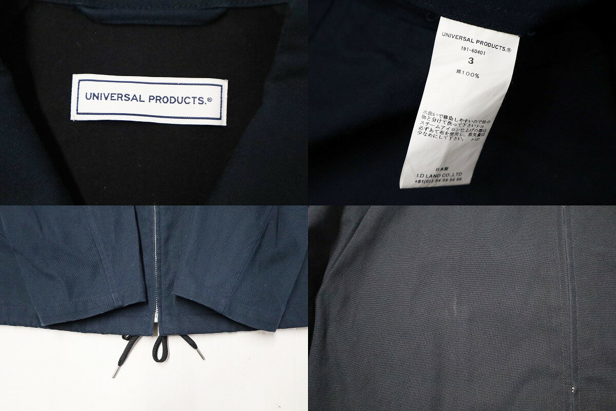 商品名 UNIVERSAL PRODUCTS COTTON ZIP BLOUSON サイズ [3](約)着丈:70.5cm 身幅:55cm 裄丈:85cm 平置きでの採寸になります。 多少の誤差はご容赦ください。 カラー Navy 素材 コットン100% コンディション 状態:BC 中古品につき使用感やスレ、多少の汚れ、襟周りに多少の色落ちがございます。 店頭併売品となりますので売り切れの際はご容赦ください。