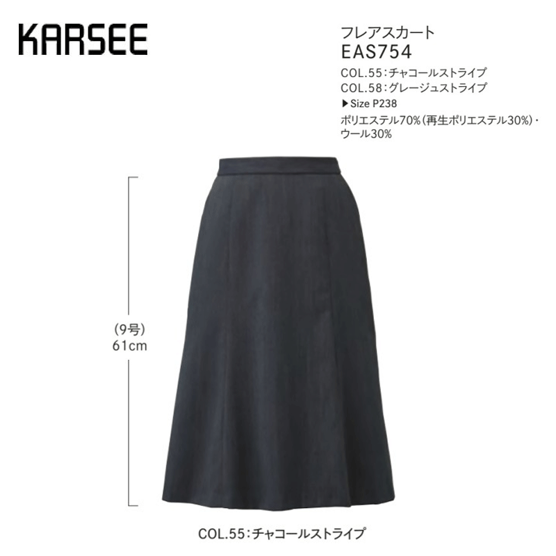 ●カラー:55:チャコールストライプ、58:グレージュストライプ ●サイズ:5〜17号 ●素材:オーラへリンボーン、ポリエステル70%(再生ポリエステル30%)、ウール30% ●備考:ストレッチ、ストレッチ裏地、カーブベルト、破れにくいスリット、3段カン、後ろファスナー、スベリ止めテープ、吹き出し防止裏地