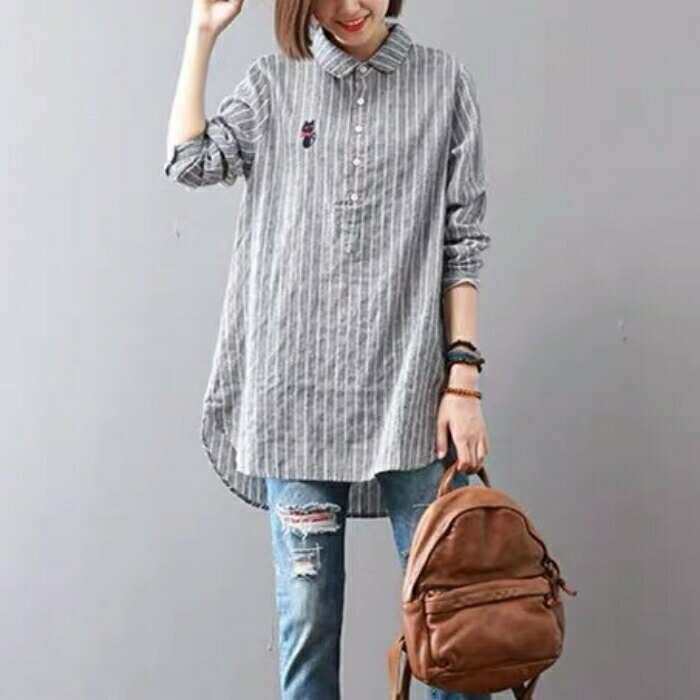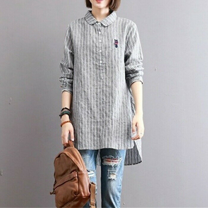 チュニック ロングシャツ 猫柄 シャツ レディース リネン チュニックシャツ 体型カバー 綿麻 トップス 着痩せ ネコ 刺繡 春秋 ゆったり 長袖 おしゃれ チュニック シャツ 体型カバー 綿麻 トップス 着痩せ ネコ 刺繡 春秋 ゆったり 長袖 5