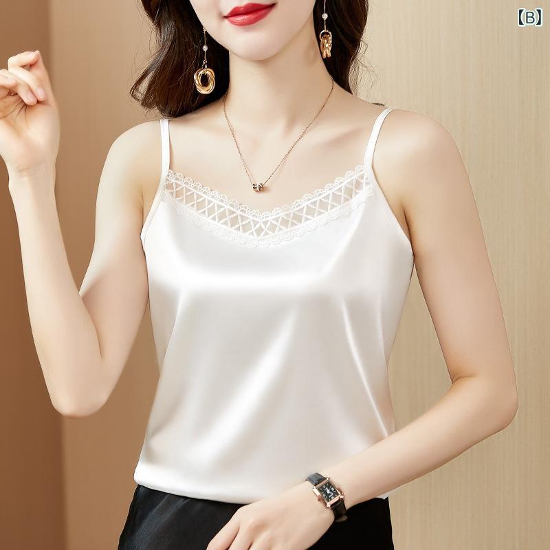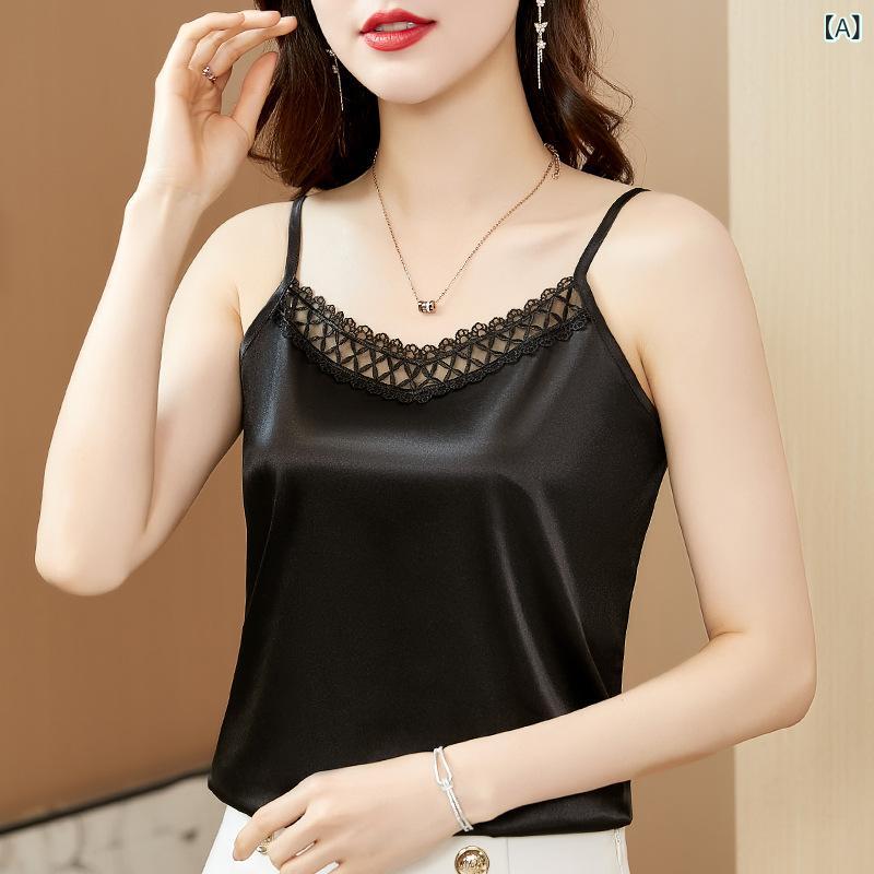 ・スタイル: キャミソール・フィット: スリム・着丈: 普通丈・柄: 無地・装飾: レース・主な素材: シルクサテン・素材構成: スパンデックス30%未満・カラー展開: ブラック、ホワイト、シャンパン、ワインレッド・サイズ展開: M、L、XL、XXL、3XL、4XL・テイスト: 通勤、上品・対象: 大人・対象性別: 女性・伸縮性: 微弱・ストラップ: シングル