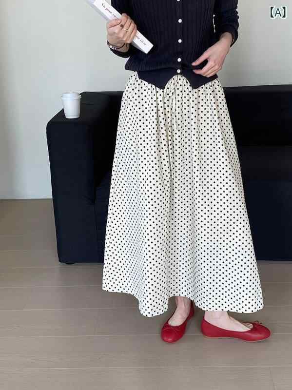 ・柄: ドット・加工: プリーツ・生地: コーマ綿・主な素材: 綿混紡(綿30~50%未満、ポリエステル30~50%未満)・スカートの形: フレアスカート・スカート丈: ロング・サイズ展開: M、L・スタイル: 日韓カジュアル、韓国系