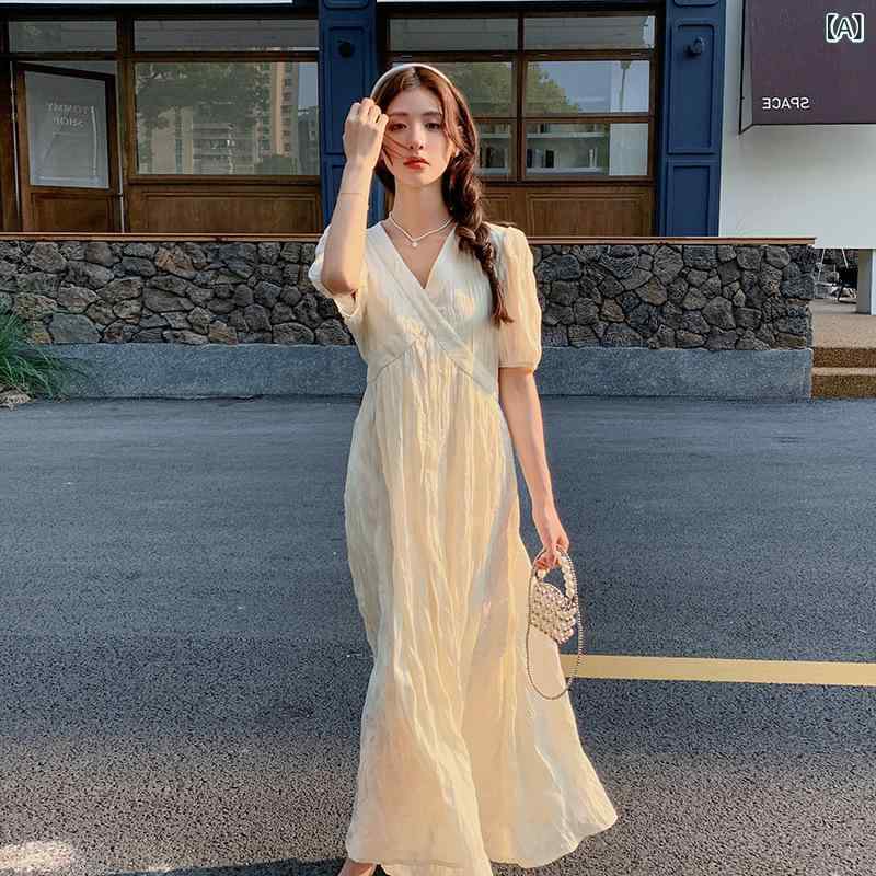 ・カテゴリ: ワンピース・スタイル: ベーシック、フェミニン・主な素材: ポリエステル・素材混率: ポリエステル80〜90%・柄: 無地・デザイン: プリーツ、切り替え・着丈: ロング丈・スカートシルエット: Aライン・ネックライン: Vネック・袖丈: 半袖・袖タイプ: パフスリーブ・ウエスト: ハイウエスト・開閉タイプ: プルオーバー・カラー: オフホワイト・サイズ展開: S, M, L, XL