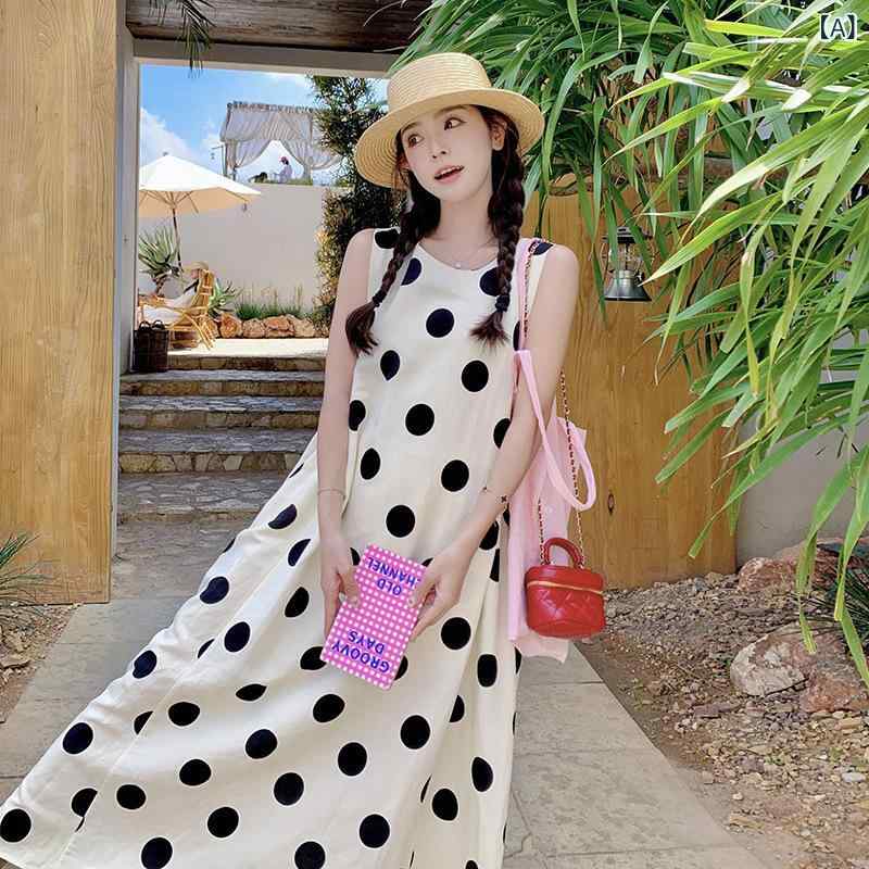 ・カテゴリ: ワンピース・スタイル: エレガント、通勤・主な素材: ポリエステル 70~80%・柄: ドット・シルエット: Aライン・スカート丈: ミディ丈・ネックライン: クルーネック・袖丈: ノースリーブ・カラー展開: 表示色・サイズ展開: S、M、L、XL
