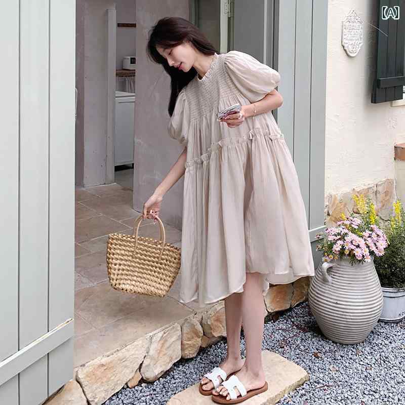 ・カテゴリ: ワンピース・スタイル: きれいめ通勤、スウィートカジュアル・主な素材: ポリエステル繊維 70-80%・丈: ミディ丈・ネックライン: クルーネック・袖丈: 半袖・カラー展開: アプリコット・サイズ展開: S、M、L、XL