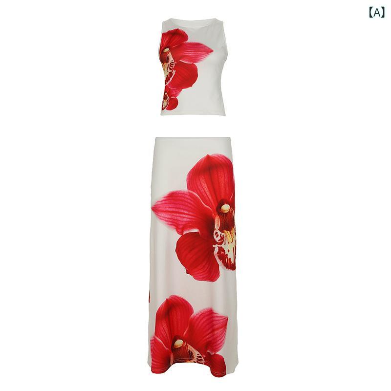 ・カテゴリ: カジュアルセットアップ・スタイル: エレガント、リゾート・主な素材: ポリエステル95%以上、スパンデックス30%以下・柄: 花柄・丈: ロング・デザイン: バイカラー・加工: プリント・生地: 再生繊維起毛・カラー: ホワイト・サイズ展開: S、M、L・セット内容: スカートセット・性別: レディース・袖丈: ノースリーブ