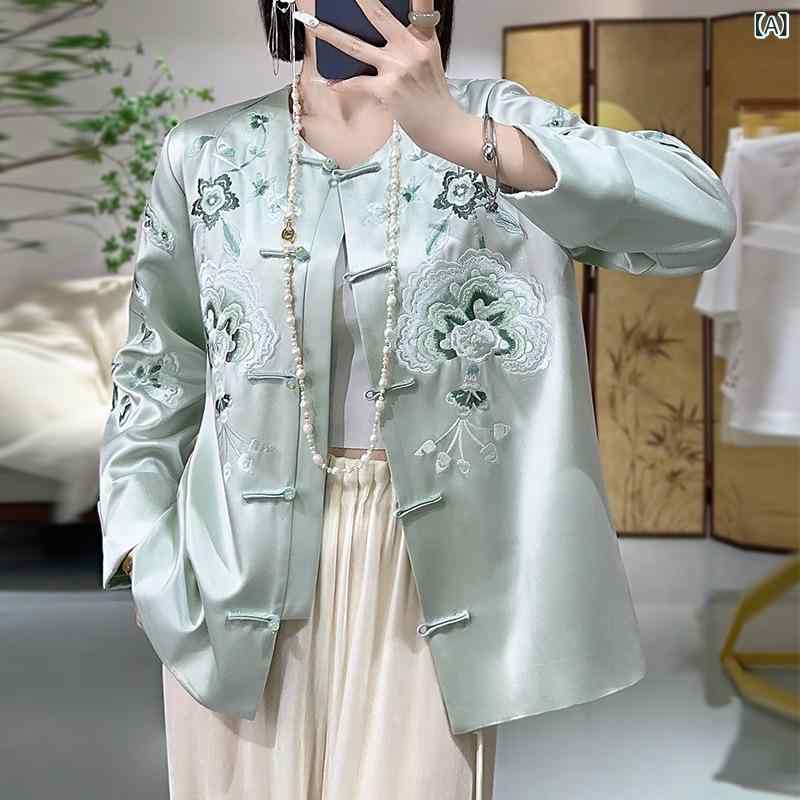 ・カテゴリ: アウター・主な素材: アセテート繊維 (80-90%)、ポリエステル繊維 (30%未満)・柄: 植物花柄・フィット: ルーズフィット・形式: 単品・厚さ: 普通・着丈: レギュラー丈・袖丈: 長袖・袖タイプ: レギュラー・ネックライン: クルーネック・要素: 刺繡・カラー展開: ライトグリーン、アプリコット・サイズ展開: S、M、L、XL・スタイル: 文芸レトロ・前立て: シングルブレスト多ボタン・テイスト: 中国風・対象年齢: 成人・対象性別: レディース
