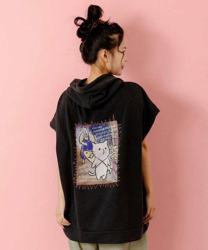 お魚屋さんから魚をもらってご機嫌なネコが、ゆるい絵本タッチで描かれたノースリーブフーディ。