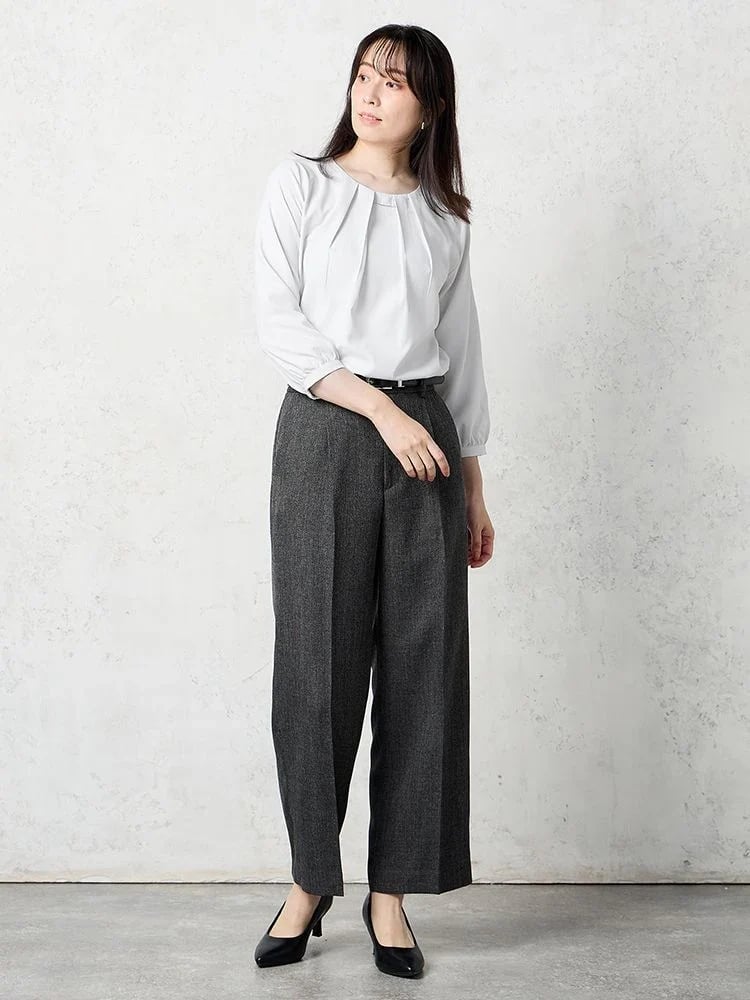 ○おすすめポイント ・柔らかで清潔感がありオフィスにぴったり ・ふんわりとしたデザイン ・取り外し可能なバーがアクセサリー代わりでポイントに 伸縮性:あり 透け感:あり 裏地 :なし 生地 :薄手 ◆モデルサイズ:身長166cm 胸囲80cm ウエスト58cm ヒップ88cm ◆着用サイズ:M