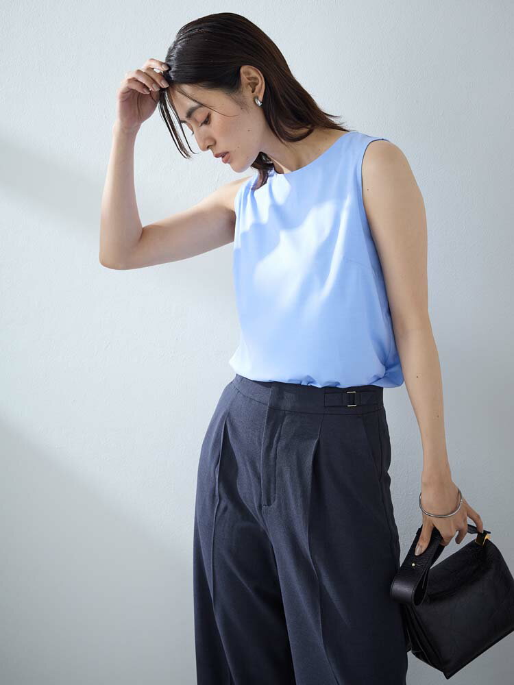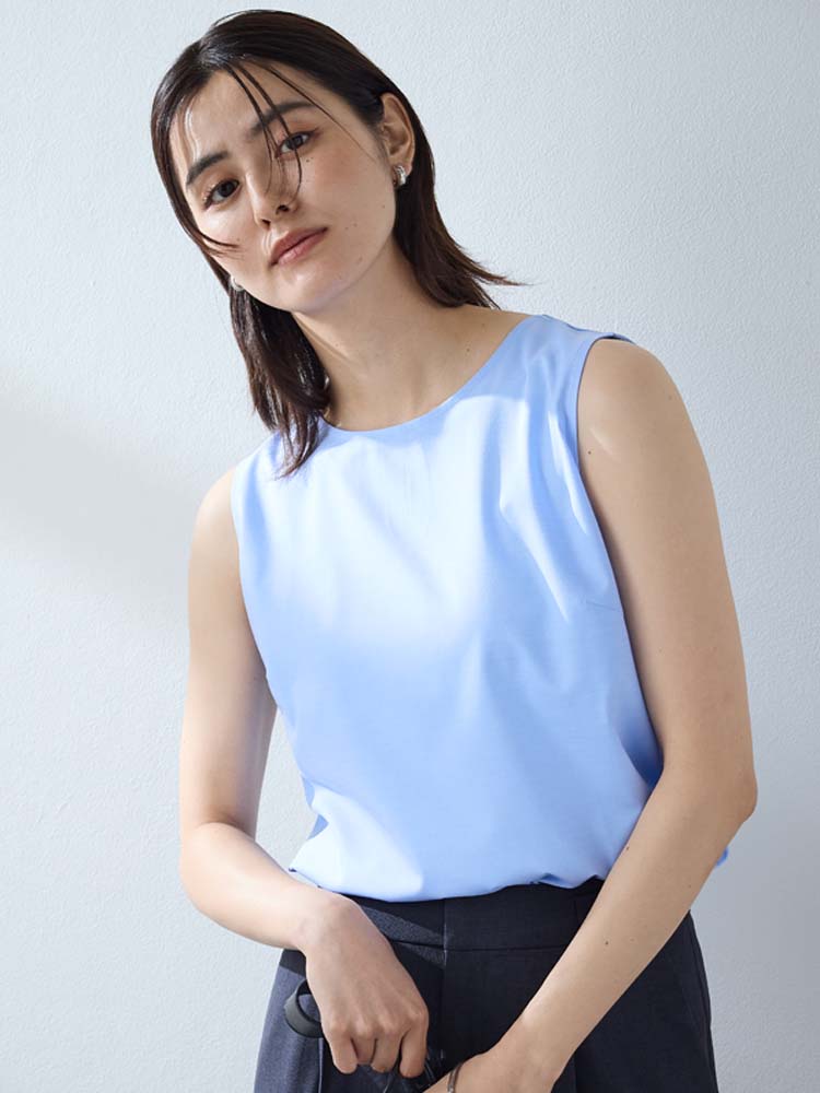商品名 <ひんやり接触冷感>シルク混ノースリーブブラウス 色 サックス 素材 ポリエステル55% レーヨン40% ポリウレタン3% シルク2% シーズン 春夏 サイズ S M L 商品特徴 ストレッチ 冷感素材 商品コメント やや光沢感のある、シルク混生地を使用したノースリーブブラウスです。