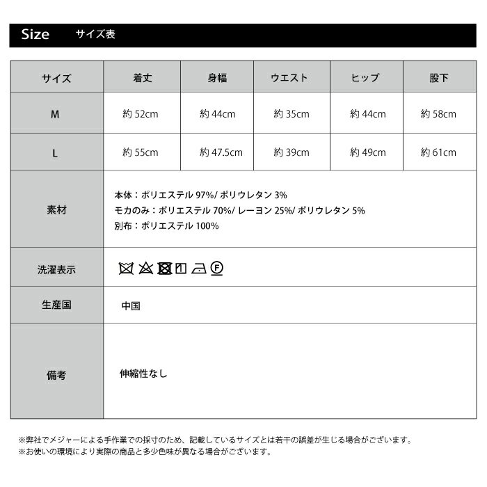 ■サイズM:[着丈]約52cm[身幅]約44cm[ウエスト]約35cm[ヒップ]約44cm[股下]約58cmL:[着丈]約55cm[身幅]約47.5cm[ウエスト]約39cm[ヒップ]約49cm[股下]約61cm