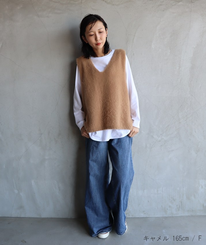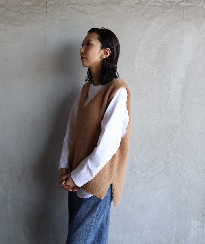 起毛加工でふわふわもこもこに仕上げたシーズンムードたっぷりのニットベスト。
