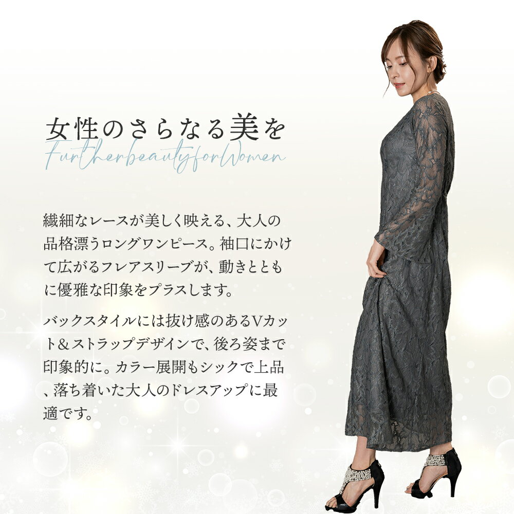 SIZE サイズ M、L、XL、3XL 実寸 サイズ 着丈 バスト ウエスト 肩幅 袖丈 ヒップ M 127 94 74 36 55.5 106.4 L 128 98 78 37 56.5 110.4 XL 129 102 82 38 57.5 114.4 3XL 130 106 86 39 58.5 118.4 カラー ブラック、ネイビー、グリーン 素材 表 地:ナイロン50% ポリエステル 50%裏 地:ポリエステル 95% ポリウレタン5% 着用シーン 結婚式、二次会、食事会、デイリー、セレモニー、発表会、オフィス ワンポイント フレアスリーブが腕周りをやさしくカバーし、華奢見せ効果◎ ハイウエスト切替で自然と脚長に見えるスタイルアップ設計 背中のVカットで視線を上に集め、全体のバランスを整えてくれるデザイン 商品仕様 伸縮性:有り裏地:袖以外裏地ありファスナー:有り 開き具:後開きファスナーSIZE サイズ M、L、XL、3XL 実寸 サイズ 着丈 バスト ウエスト 肩幅 袖丈 ヒップ M 127 94 74 36 55.5 106.4 L 128 98 78 37 56.5 110.4 XL 129 102 82 38 57.5 114.4 3XL 130 106 86 39 58.5 118.4 カラー ブラック、ネイビー、グリーン 素材 表 地:ナイロン50% ポリエステル 50%裏 地:ポリエステル 95% ポリウレタン5% 着用シーン 結婚式、二次会、食事会、デイリー、セレモニー、発表会、オフィス ワンポイント フレアスリーブが腕周りをやさしくカバーし、華奢見せ効果◎ ハイウエスト切替で自然と脚長に見えるスタイルアップ設計 背中のVカットで視線を上に集め、全体のバランスを整えてくれるデザイン 商品仕様 伸縮性:有り裏地:袖以外裏地ありファスナー:有り 開き具:後開きファスナー