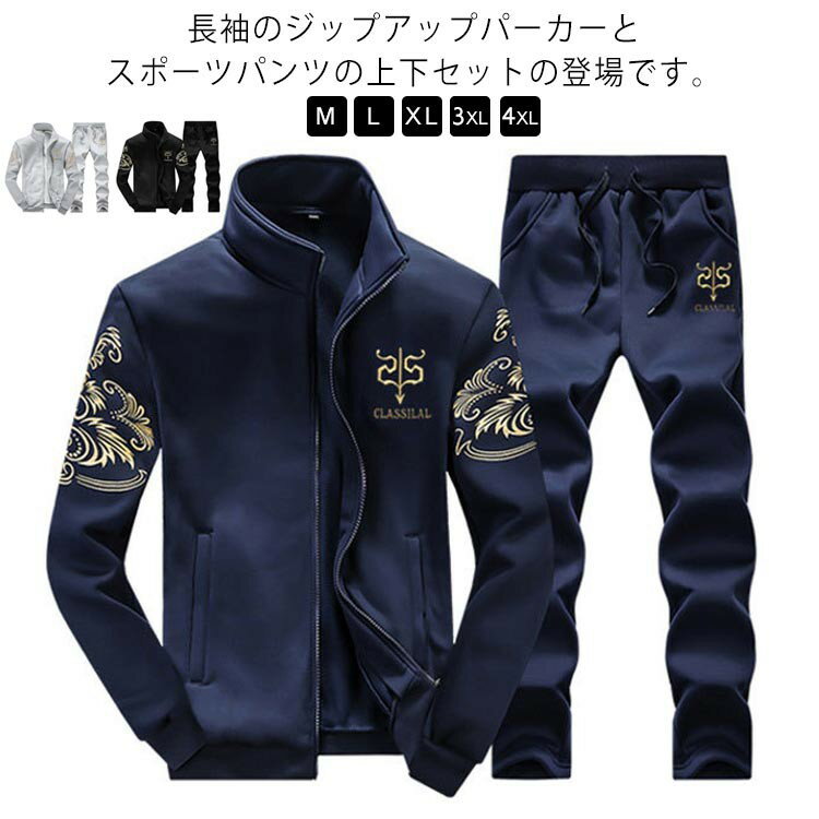 長袖のジップアップパーカーとスポーツパンツの上下セットの登場です。