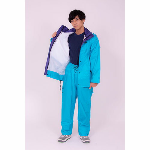 6カラー9サイズのレインスーツ・雨の日に働く方を一番に考えた画期的なレインスーツ ・パンツ丈、袖口・裾幅などサイズを自由に調節できるのであらゆる体型にもジャストフィット! ・太もも横の調節ボタンで、かがむことなく簡単に裾丈を最大12cm短の調節が可能。