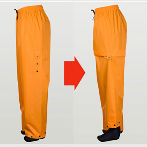 ・パンツの裾幅の調節ボタンにより雨水の跳ね上がりによる浸水を防ぐ。