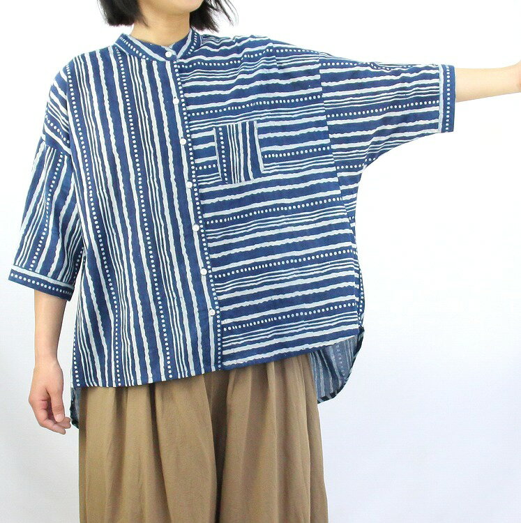 インド綿 ブロックプリント ブラウス 前開き ゆったり 草木染 バグルー ドロップショルダー 綿100% 装いに涼しげなアクセントを添える、インド綿100%のブロックプリントブラウスです。