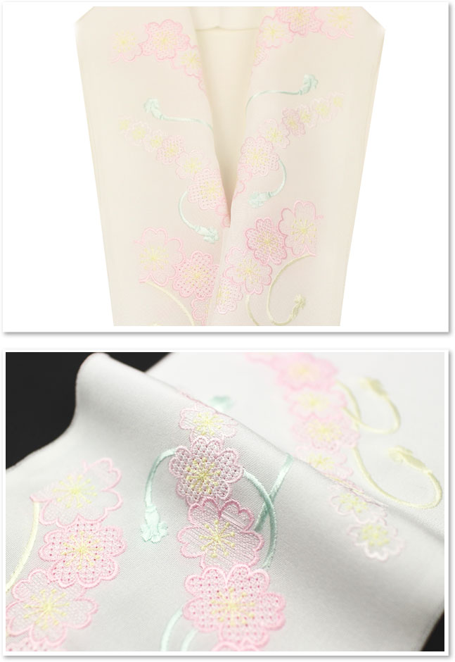 こちらは、白の生地に桜の花と組紐をピンクを基調に刺繍を施した半襟です。