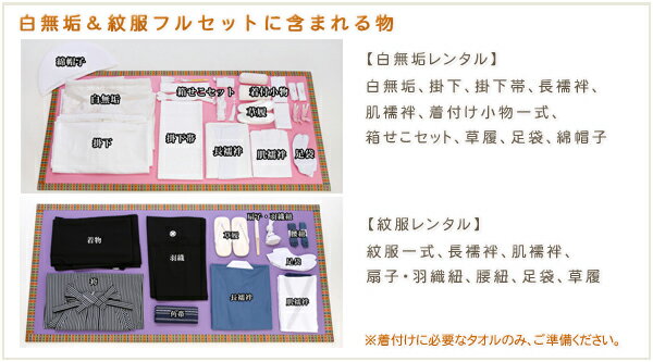 【レンタル内容】 [白無垢レンタル]白無垢、掛下、掛下帯、長襦袢、肌襦袢、着付け小物一式、箱せこセット、草履、足袋、綿帽子 [紋服レンタル] 紋服一式、長襦袢、肌襦袢、角帯、扇子・羽織紐、腰紐、足袋、草履