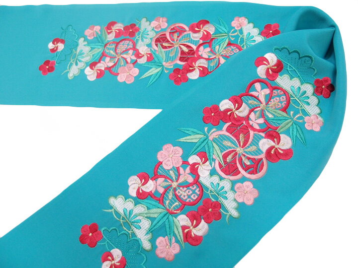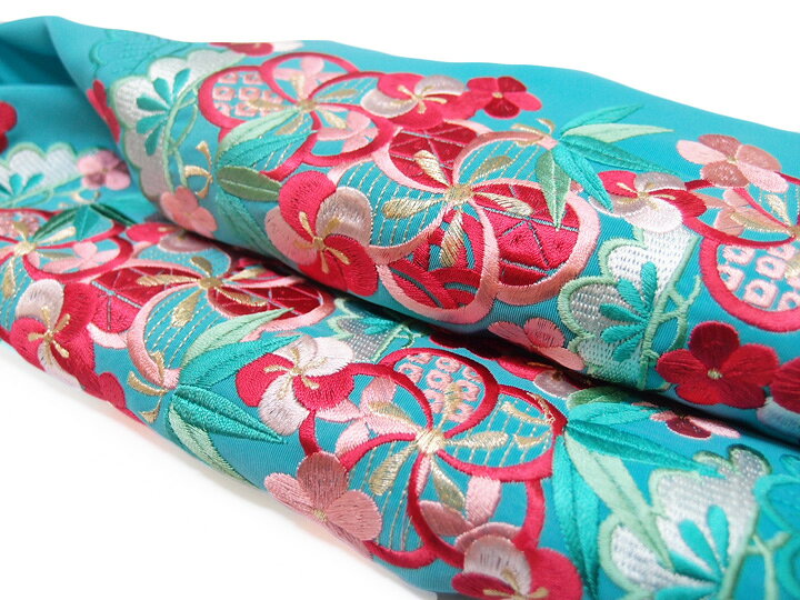 色 地色は華やかなトルコブルーで、華やかなピンクの濃淡と緑の濃淡の刺繍 画像1が実際に近いお色です。