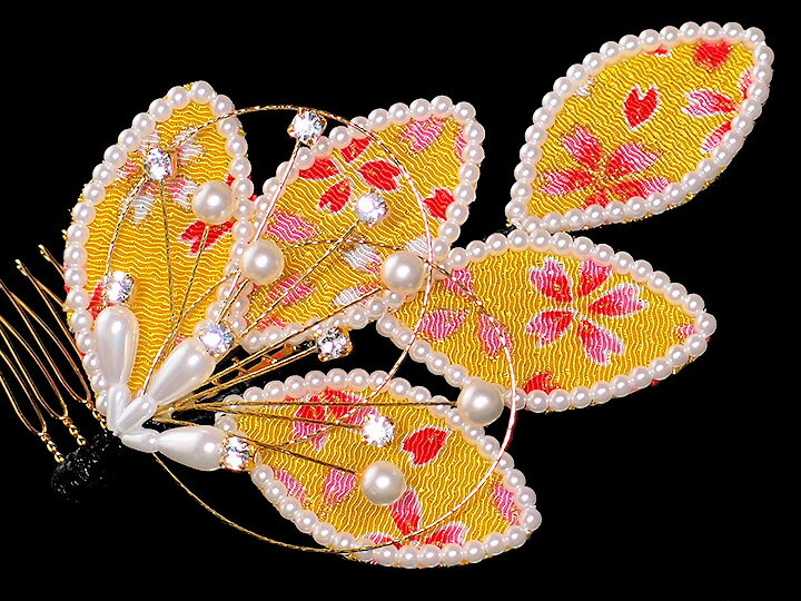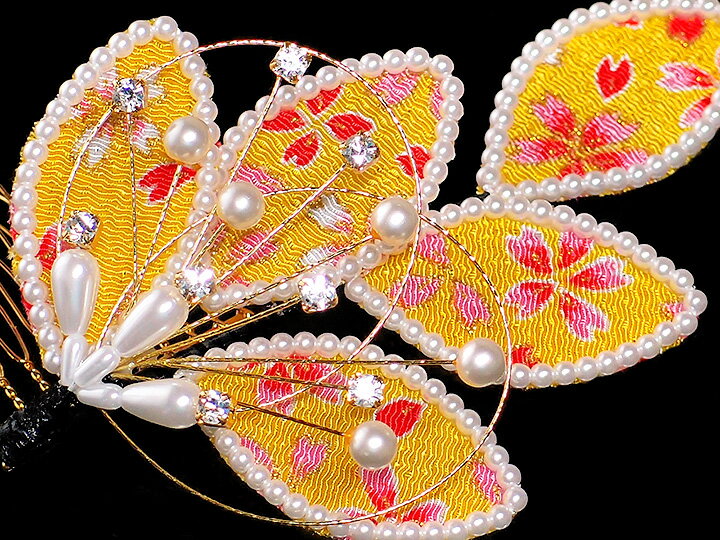 ◆サイズ 約11cm×約7.5cm パールビーズ:3mm・6mm ◆材質 ちりめん パールビーズ ラインストーン 水引 金属 コーム ◆色 鮮やかな山吹色 ◆ご利用シーン 成人式、結婚式 入学式 卒業式 入園式 卒園式 お宮参り 七五三 パーティー 振袖の他、留袖 訪問着 などのフォーマルなお着物にご利用頂けます。