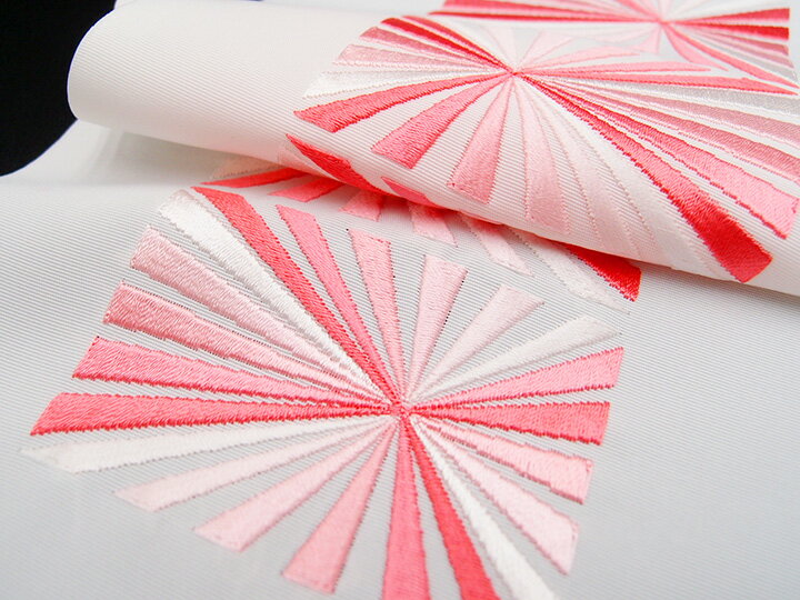 ◆素材 シルエリー Silelly 新・合・繊 刺繍 日本製 生地:ポリエステル100% 刺繍糸:レーヨン100% ◆シルエリーの特徴 1.正絹風のつややかな光沢と滑らかな肌触り 2.ハリ・コシに大変優れています 3.制電性を備えており、洗濯しても効果を維持します 4.洗濯の際にはドライクリーニングをお願い致します ◆色 白地にピンクのグラデーション ◆商品説明 放射状に輝く光のような幾何学柄を刺繍であしらった振袖用半衿です。