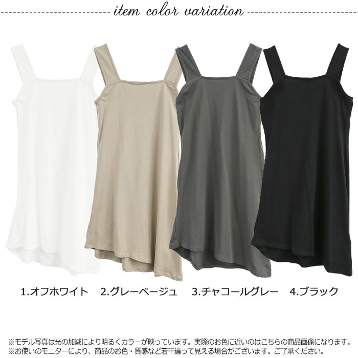 ※モデル身長:160cm素材コットン100%サイズ[Mサイズ]着丈(前/後)74/56cm・身幅37cm・裾幅(前/後)51/63cm [Lサイズ]着丈(前/後)74/56cm・身幅40cm・裾幅(前/後)54/65cm [LLサイズ]着丈(前/後)76/58cm・身幅43cm・裾幅(前/後)57/68cm [3Lサイズ]着丈(前/後)76/58cm・身幅46cm・裾幅(前/後)60/73cm [4Lサイズ]着丈(前/後)78/60cm・身幅50cm・裾幅(前/後)63/76cmカラー1.オフホワイト・2.グレーベージュ・3.チャコールグレー・4.ブラックメール便配送メール便可商品説明アシンメトリーシルエットのブラ紐隠しキャミソールワンピースです。