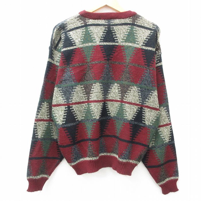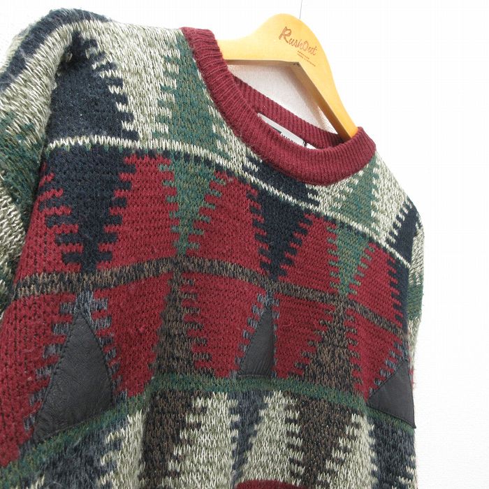 【商品名】 L★古着 長袖 セーター メンズ 90年代 90s レザー使用 アクリル クルーネック エンジ他