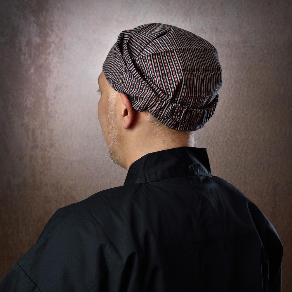 後ろはゴムで絞っているので伸縮性があり、ピタッと頭にフィットする感じはまさにバンダナですが、見た目はまるで手拭いの喧嘩被り。