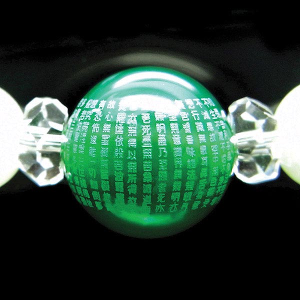 材質/般若心経彫りグリーン瑪瑙(12mm)×1、翡翠(8mm)×16、グリーン瑪瑙(8mm)×3、カットボタン水晶×8、シリコンゴム使用 内径/約17cm 重さ/約21g 仕様/中国産 (加工:日本)いつの時代も人の心を癒す経典、「般若心経」。