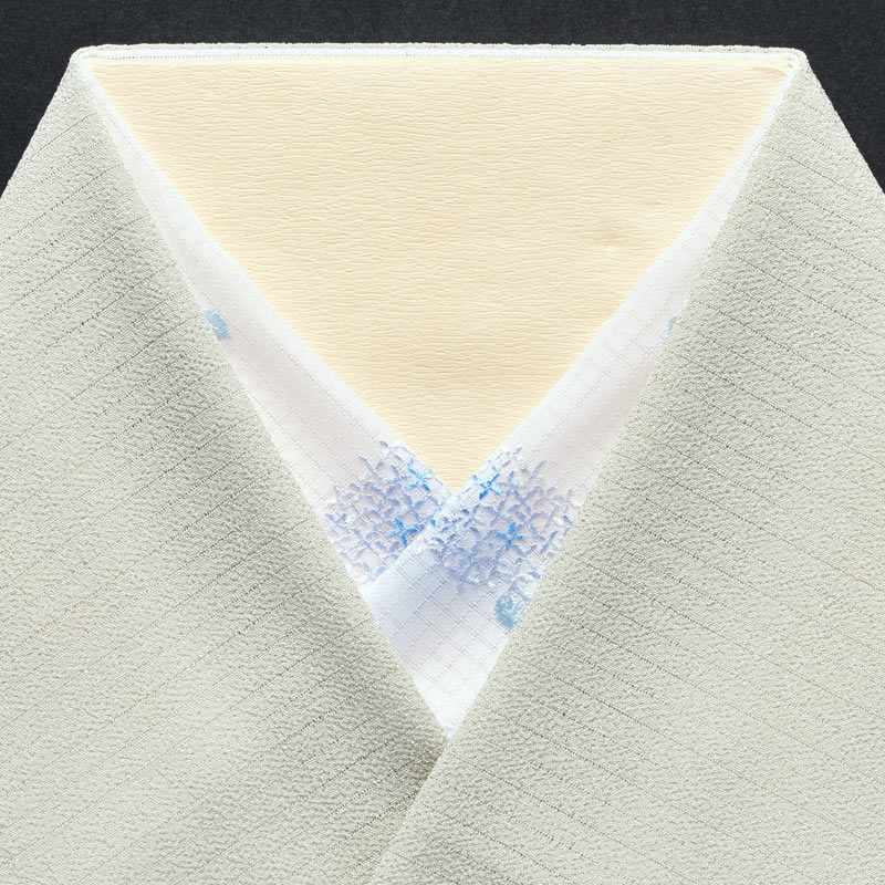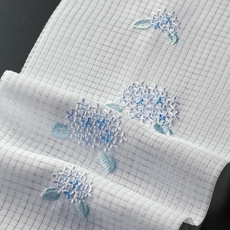 格子地で透け感があり、見るからに涼やかな感じがする紫陽花の刺繍半衿は、 浴衣にも使用出来ます。