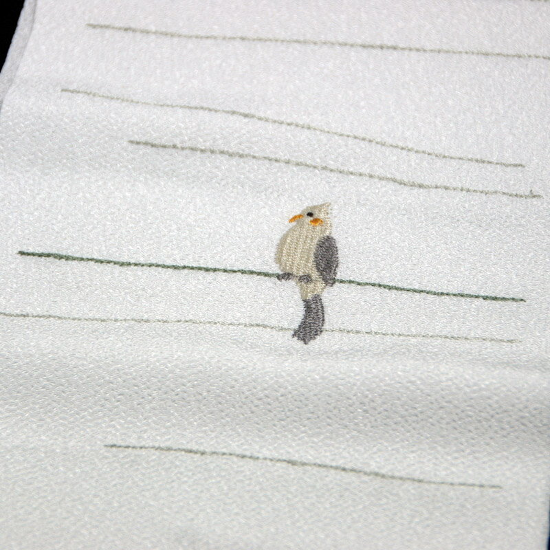 白地のポリエステル縮緬に、グリーン系の止まり木とオカメインコを刺繍しました。