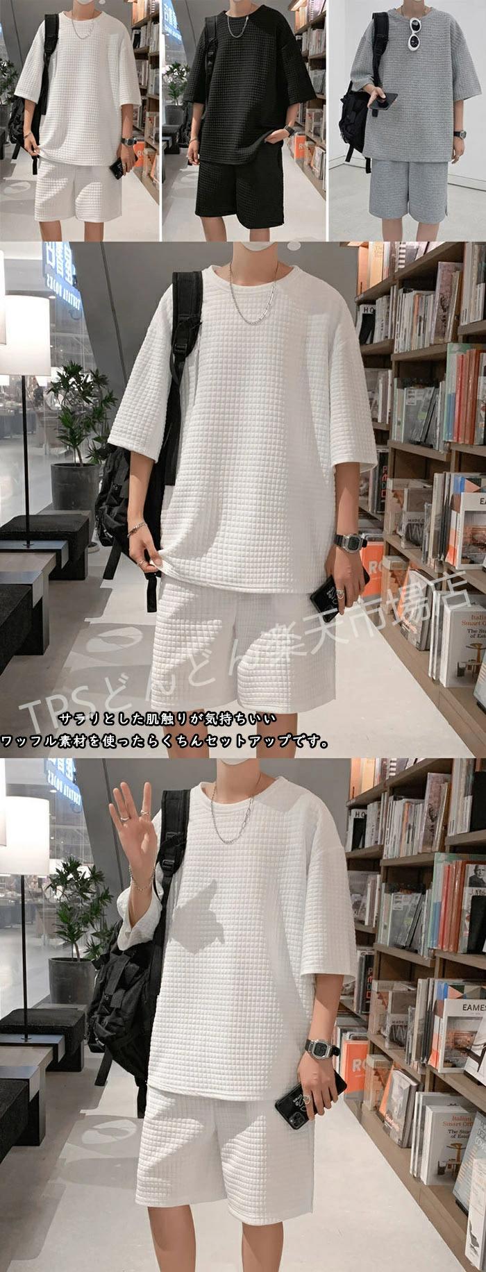商品名 セットアップ メンズ ファッション 商品紹介 サラリとした肌触りが気持ちいいワッフル素材を使ったらくちんセットアップです。