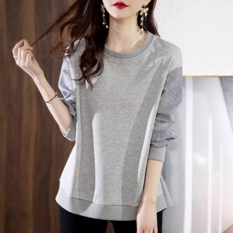 』袖のスラッシュから覗く配色ストライプで着映え確実!華奢見せとセンスアップが両方手に入る、異素材ボリューム袖スウェットです。