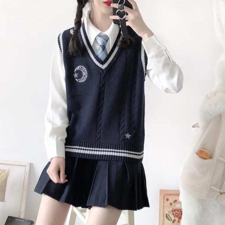 配色ラインと太陽や月、星の刺繍がながらに個性が出せるニットベスト。