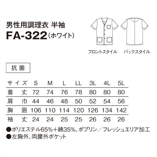 FA-322 男性用調理衣 半袖 ホワイト 5L SERVOサーヴォ・サーボ(旧)サンペックスイスト 料理衣 調理衣 白衣 大きいサイズ 素材:ポリエステル65%+綿35% ポプリン フレッシュエリア加工 機能:抗菌 特長:左胸外、両腰外ポケット 日本の伝統「和食」にぴったりな白衣!寿司屋、うどん屋、ラーメン屋、割烹、小料理屋、料亭など、日本料理、郷土料理、京料理、精進料理、海鮮料理など和を扱うお店にぴったりな白衣・調理衣・料理衣を格安・激安でご提供。