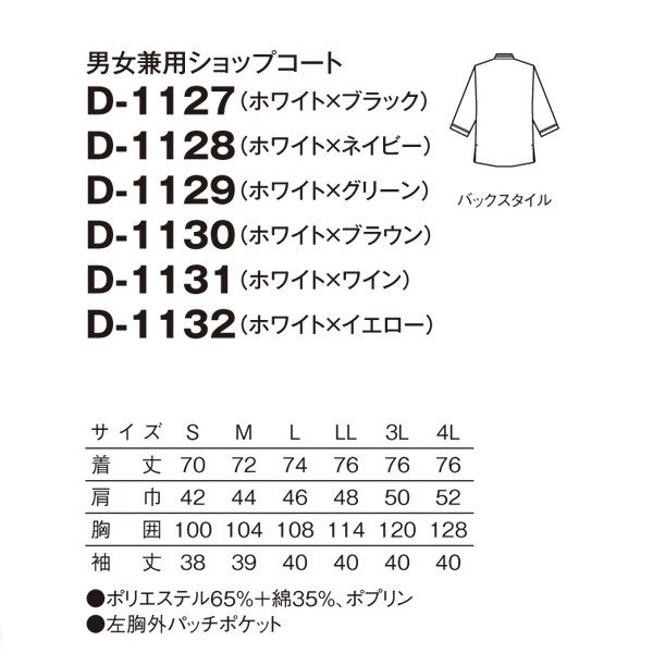 D-1130 男女兼用ショップコート ホワイト×ブラウン S〜4L SERVOサーヴォ・サーボ(旧)サンペックスイスト 飲食店 レストラン カフェ 居酒屋 バー 素材:ポリエステル65%+綿35% ポプリン 特長:左胸外パッチポケット ショップコートで統一感を!どんなスタイルにも合う汎用性の高さが魅力。