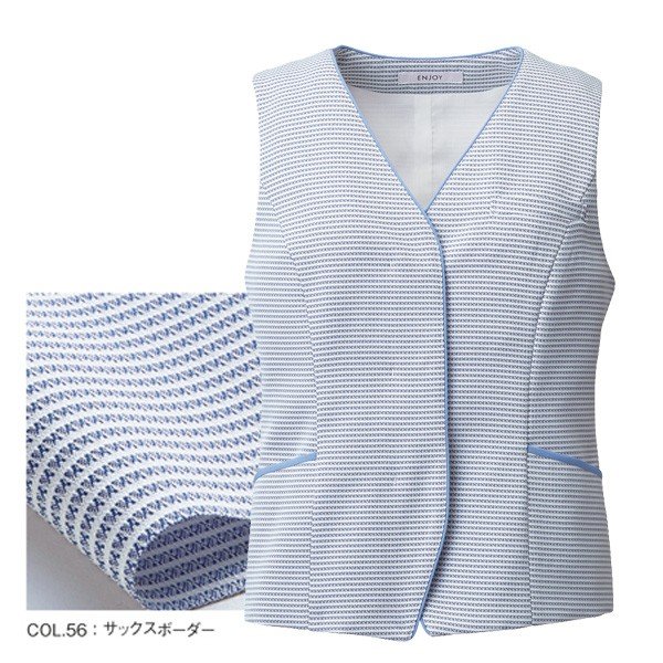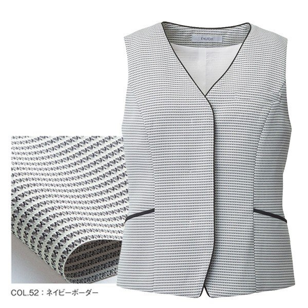 清々しく、上品な佇まい。 涼しげで爽やかなボーダーをミニマムなデザインに落とし込んだ「クリアボーダー」シリーズ フロントすっきり見えの比翼デザインが魅力の爽やかな夏ベスト。 制菌加工で清潔さをキープした医療事務・クラークの方にもオススメ。 ポリエステル100% カーシーカシマKARSEEエンジョイENJOYオフィスウェア事務服・春夏サマー