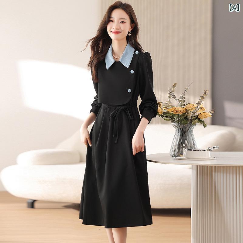 ・カテゴリ: ワンピース・スタイル: エレガント・主な素材: ポリエステル90~95%・加工: パッチワーク・丈: ミディ丈・スカートタイプ: Aライン・ネックライン: ポロカラー・袖丈: 長袖・ウエスト: ミドルウエスト・開閉: プルオーバー・カラー展開: ブラック・サイズ展開: S、M、L、XL