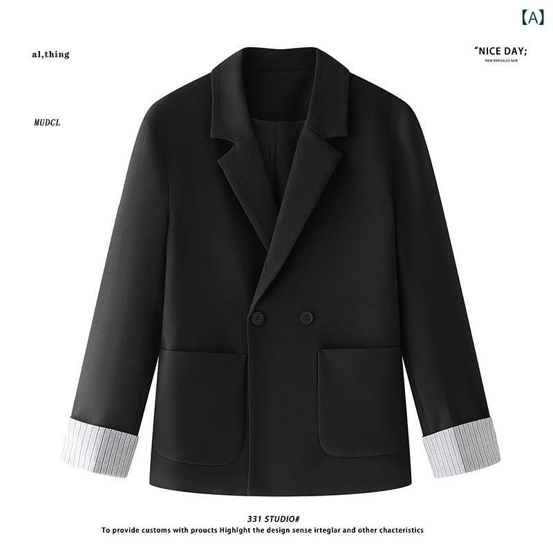 ・ターゲット層: ファッション都市 (24-35歳)・フィット: スリム・襟タイプ: ノッチドラペル・スタイル: 韓国風・柄: カラーブロック・素材: 化学繊維混紡・主な素材成分: ポリエステル・裏地素材: ポリエステル・着用シーン: カジュアル・ベント: サイド・対象: 青年・加工: 先染め・デザイン詳細: ボタン装飾・着丈: レギュラー・袖丈: 長袖・カラー: ブラック・サイズ展開: M, L, XL, 3XL・裾デザイン: ラウンド・年齢層: 成人・性別: メンズ・カテゴリ: カジュアルジャケット