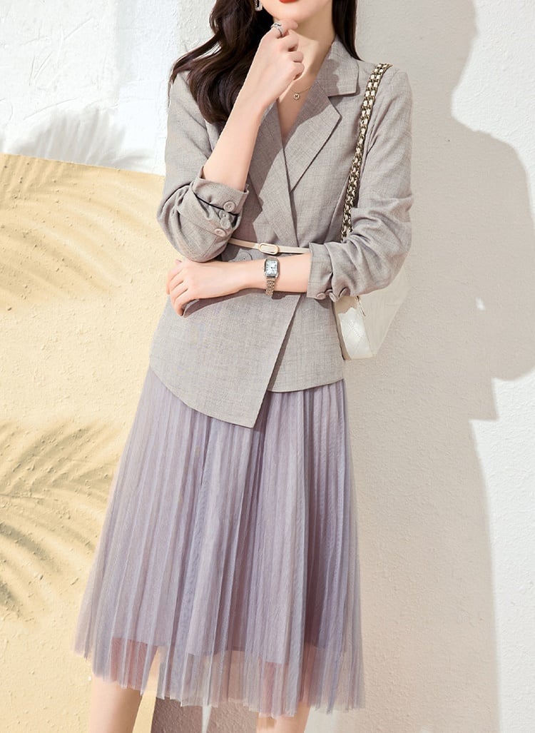 チェック風の織り方がシックな気品あふれるジャケット&プリーツスカートのセットアップです。